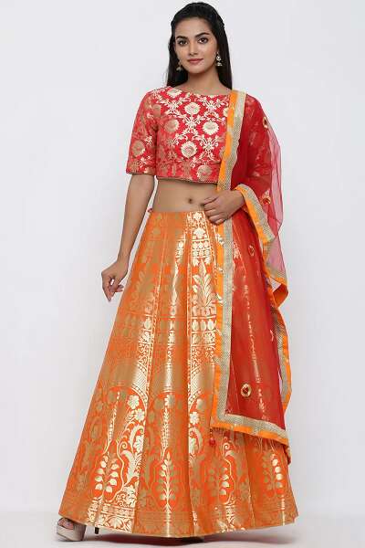 Brocade ghagra choli is a heavily woven material that creates the effect of raised work. Silk threads are combined with either gold or silver threads, and...