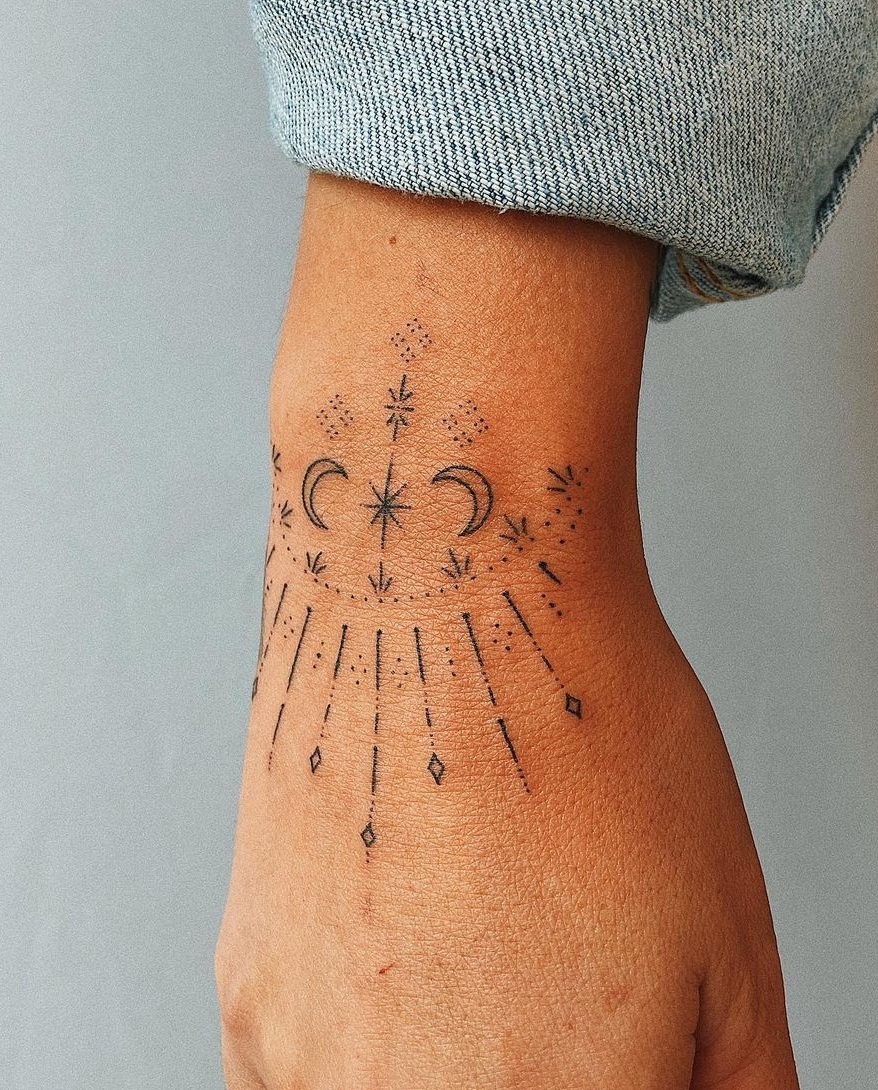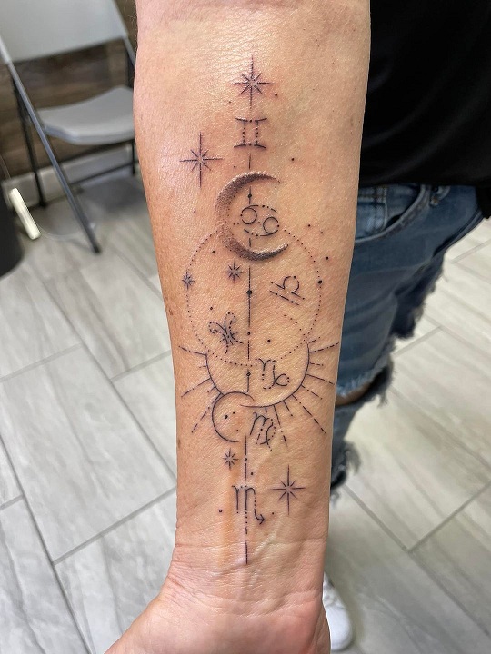 These are the most basic types of celestial tattoos. They may be of any shape, design, colour, etc. The main thing about these tattoos is that they are mysterious, and you may want to utilize your brain when you see them. They are commonly made on the hands and legs.