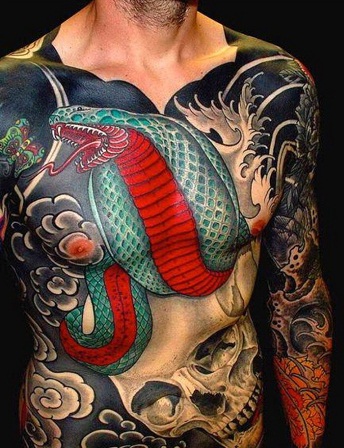 This is the best example of a chest tattoo design for men. The tattoo covers not only the chest but also the full body till the belly. The tattoo includes a snake and a skull. Both of them symbolise death and evil or victory over the evil. The snake also is a symbol of power and strength. While in some religions the cobra snake is also worshipped and is counted as a pious God. The beautiful colour combination makes it more eye-catchy.