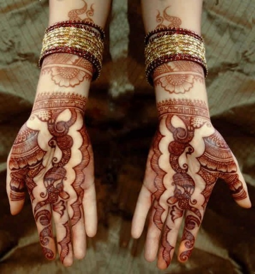 Peacock is one very popular motif spotted in many bridal henna mehndi designs. Intricate peacock patterns require skilled hands and are not for beginners, but with little practice can put on beautiful peacock Mehandi designs. Two peacocks with grand designs can be seen on the walls of the royal palaces of Rajasthan.