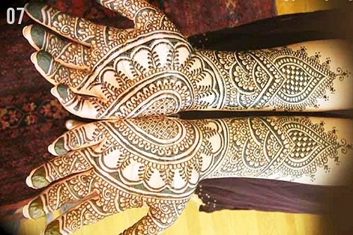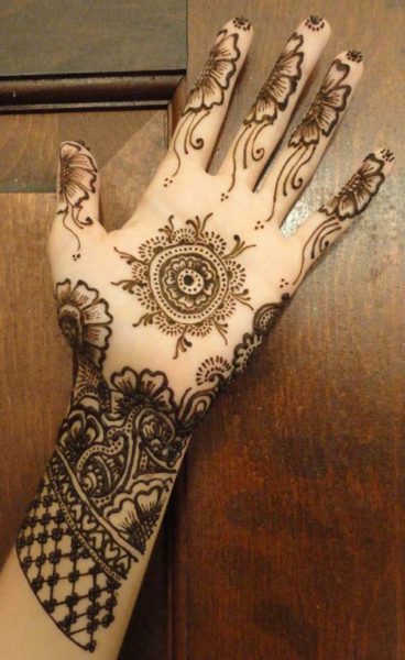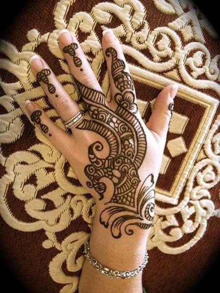 These Marwari Mehandi designs combine floral, paisleys and spiral patterns. They don’t include as many flowers or other shapes. This design is a little contemporary and designed to create a very appealing visual effect; gaps between the structures accentuate the pattern’s beauty.