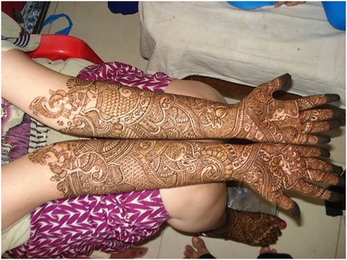 These heavy mehendi designs are worn mainly by the bride, groom, and their close relatives. These new Marwari Mehandi designs are incredibly complicated and elaborate. They feature typical figures of a bride and groom with many other images of the paraphernalia included in weddings, and this design covers every inch of the skin and lends a rich look.