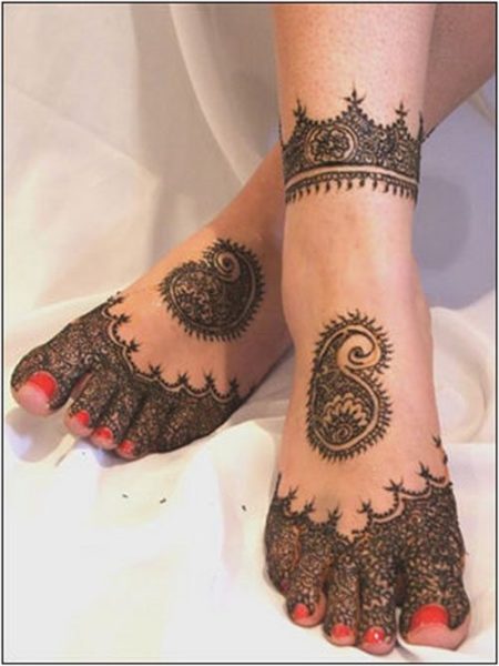 This mehendi design for legs is a stop-and-stare piece. The beauty of the legs is well defined in the excellent mehendi design that is well thought out. The foot mehndi designs are elaborate and sport intricate detailing and patterns like anklets with the right nail polish, highlighting the mehendi design.