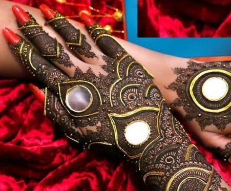 This is the latest Marwari Mehndi design carved with a heavy design using some golden colour glitter and a mirror. The design outlines have been highlighted with gold glitter, and in the middle of the invention, a big mirror has been placed to make it look more lavish. It creates curiosity in everyone to notice the Mehandi design deeply.