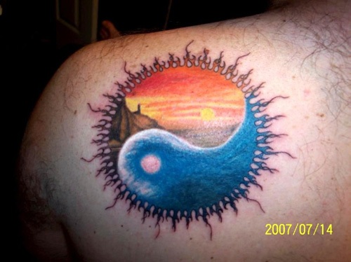 A Yin Yang tattoo which has been inscribed in an artistic style is sure to look marvelous. The presence of two different sceneries, one which depicts sunset and the other which shows the romantic beauty of the night looks mesmerizing and appealing to the eye.
