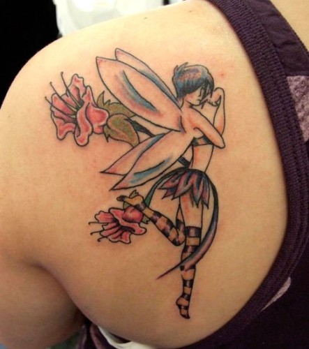This angel/pixie depicted here is definitely fun loving and quirky as she poses in a definite way, standing on one toe while the two beautiful flowers behind her speaks of a softer meaning connected to beauty and grace. Definitely a very cute tattoo for women.