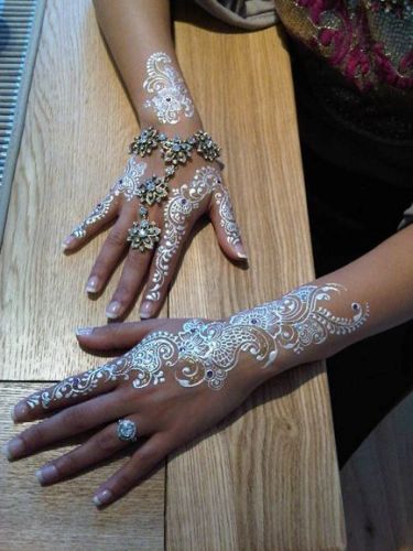 This white mehndi art will make you mesmerize. Glitters has been used for enhancing look, however, this is metallic henna. This Mehandi is at the back of the hand and will suit for adolescent girls. This can even be used for wedding for the bride who wants to be unique.