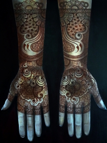 This stunning Arabic design is given with a combination of black and white, which starts from tip of the finger and is stretched till the arm. The floral strokes with a spiral line design are looking simple yet elegant. The gaps are accentuated with white glitter in between the design. This is one of the magnificent Mehndi by Bisha Mistry.