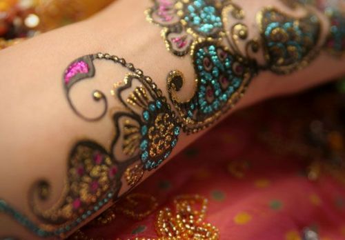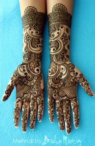 This flawless colored mehandi design looks more elegant on the hands. This is one of the unique Bisha Mistry Mehndi Design. It is designed with a very rare combination of gold, pink and blue. Blue stones are places on the gapes and pink glitter is filled on the edges. Gold glitter is used to highlight the complete design.