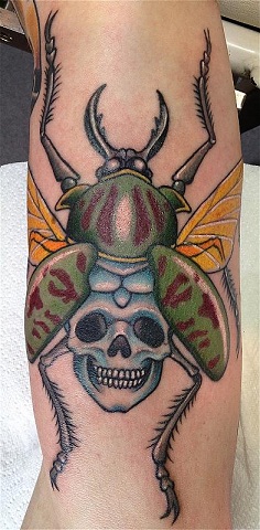 An amazing tattoo design that can be portrayed by anyone and appear more charming than ever. In the other half body of the beetle, the skull is designed with large eye sockets representing eternity. The design has been beautifully inked on the sleeves and lends a striking look to the wearer.