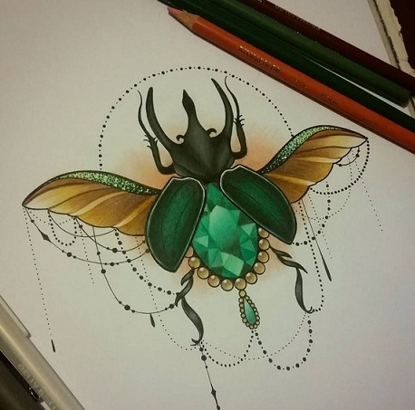 Here comes a gorgeous, mind-blowing tattoo design. In this, the beetle body parts have been styled with gems and stones and the wings have been glittered with green looking impressive from every corner.