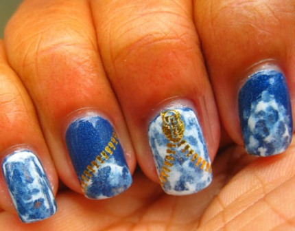 Try out the above design using zipper decals and some dry marbling of blue on a white base paint. You can easily try this nail art design out but make sure that you have the rightly placed the zipper designs.