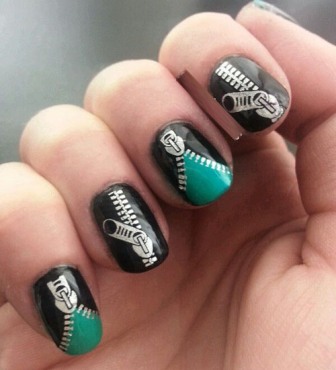 A duo toned jeans and zipper nails can be created using two colours of nail polishes like it’s used here green and black. You can use a striper for the demarcation so that you don’t go overboard with the colouring. Now add the water decal zippers and seal it off with a transparent polish. You’re done!