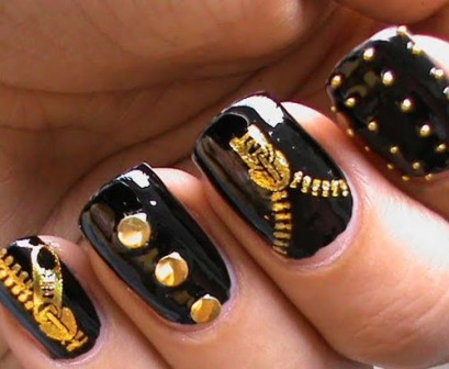 Got black jeans? Try out a black Bling zipper nail art. Use some Bling or stud materials like small metal beads and big stones in gold or metal sequins. Finish off by laying properly the zipper decals and cover with a transparent top coat. Don’t you want to give this a try?