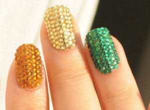 Always use a combination of colours for your nail art if you want them to look bright, full and lively. Colourful rhinestones, especially in golden and green look fabulous on your nails and give it a very bold, flashy and fun look. In the end of the decoration of your process, your nails will look shiny and well polished.