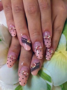 Your nail art will look adorable if you design them in colours like light pink and add small rhinestones on them. Polka dots will make it look all the more cute and pretty.