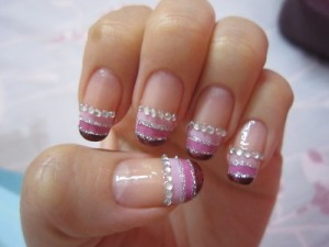 Some women like their nails to look subtle and pretty. For them, we have subtle rhinestone nail art. This looks best with French manicure. A light peach nail polish along with some small rhinestones studded in a twisted design is just marvellous in appearance.