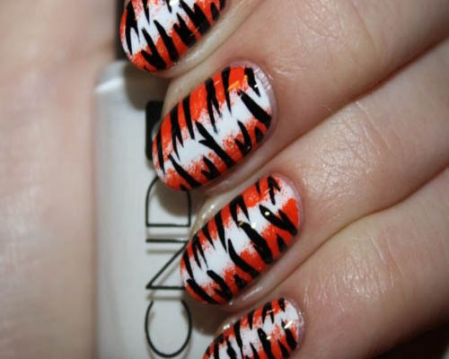 You can recreate this same design by using 2 colours for the base viz. White and orange. Use a sponge for the air brush effect of the base colours. Lastly you can use a nail art brush to draw tree branch shapes from both sides dragged into the centre for the zebra pattern. An awesome idea for a nail art!