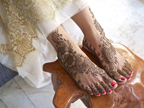 Mehndi designs for legs will always give a great look; this design combines big floral, paisleys and spiral patterns which will be beautiful on any girl’s flawless skin. Fingers have been done separately without covering the complete feet. This design will be good with any ethnic wear.