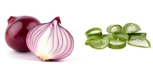 Aloe vera is very well known for its moisturising and conditioning properties. It also helps in repairing dead skin cells on the scalp and prevents itching and flaking of the scalp. It improves the strength and shine of the hair along with onion juice.