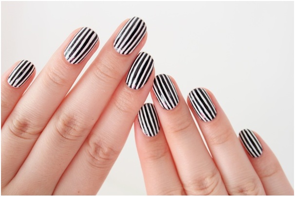 Check out this uber chic nail art style with vertical stripes, You can also create horizontal lines and make a pattern you like. These are prefect to match with your casual outfit and reveals your sense of style. Check out how to create them perfectly at home.