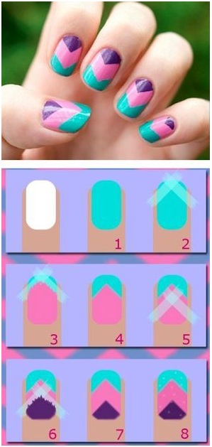 This is one of the most trendy designs out there. The nail art makes use of three different colors juxtaposed with each other. You can try this colourful art with three different nail polishes that can match your outfit. It is also quite easy to make.
