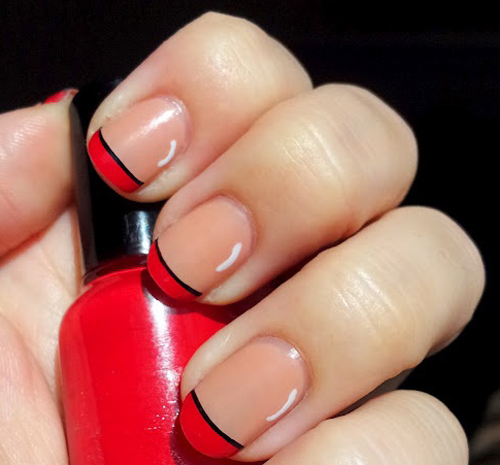 Paint the tips of your nails with rich red color gel, the picture below shows that you don’t need a long nail to do this, but still the effect of the nail art would look good on long ones. After you’ve dries the red paint, take thinnest of the brush and color it with black to make the strips just below the red paint and to add to the shine, paint the nails with gloss nail paint. This is enough to give you an elegant looking nail art just as you see in the image.