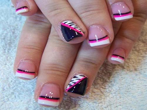Follow the steps of white French tips to do the initial part of this nail art. Leave your ring fingers for a different nail design, as we can see that it has an oblique stripe made with pink in the middle and to its left it has black painted and to the right its has zebra stripes. The zebra stripes have been made by giving a base of white of the right side and stripes in black just as we saw in the previous one. Take pink color on a thin brush and paint a horizontal stripe just below the white tips, and a black stripe below the pink.