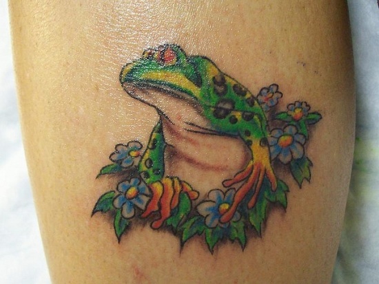 This is a 3D and embossed frog design done with floral prints. You can do these formats quite quickly, and also, these are pretty colourful if you want a colourful design with flowers. This is one of the popular frog tattoos for girls.