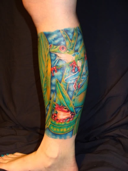 This is a scenic tattoo design with a few frogs. This is very creative, and this is also very colourful to sport easily.
