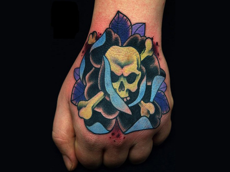 The image by new school artists is somewhat different from others; though the old school inspires their thought, the depiction style and bold colours make it remarkable and marvellous at times. The skull tattoo signifies death, but it has been sketched in a mind-altering way at the wearer’s hands.