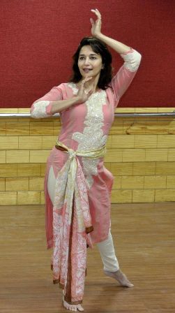This is another snap of madhuri dixit without makeup from the practice if the same event as seen above. She is wearing a sea-green printed ‘salwar’ which also has colours of white, yellow and maroon on it. She is clicked again while she is practising. Her hair is parted from one side and tied as a pony at the back.