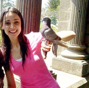 This is an off-screen picture of Sanaya that we see below. She is without make up and looks cute with her natural fair skin tone. She is in a casual pink top and has a watch on her wrist. She has her nails painted and a pigeon sitting on her fingers are making her smile so beautifully and thus the picture has been clicked.