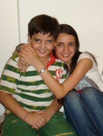 This is a cute off-screen picture of Sanaya Irani with her brother. She looks pretty and as usual is in her casuals; a white printed top with a pair of blue jeans. She has a sleek silver watch in her hand and holding her brother by his neck, they pose sweetly.