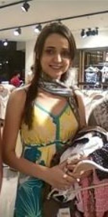 This picture has been clicked while Sanaya Irani was shopping as we can see a lot of clothes in her hands. She is looking simple and pretty without make up, wearing a yellow and blue dress and taking a grayish stole around her neck. She has clipped her hair at the back and the fringes in front are falling on her face from two side. She has a part of her hair from the hair laid in front and rest at the back, making her hair style look better.