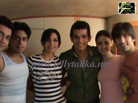 This picture below has been clicked on the sets of the serial ‘Miley Jab HumTum’. Sanaya is with her co-stars here. She is wearing a baby pink sleeveless top. Her hair is parted from the middle and has been tied as a pony tail. She is naturally beautiful with her sweet smile.