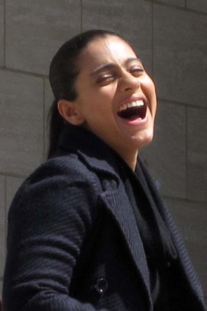 A snapshot from her movie ‘My Name is Khan’ captures a wide laugh in the picture we see below. She is wearing a black dress covered with a lighter shaded black jacket and has a muffler around her neck. Her hair is neatly tied at the back like a pony.