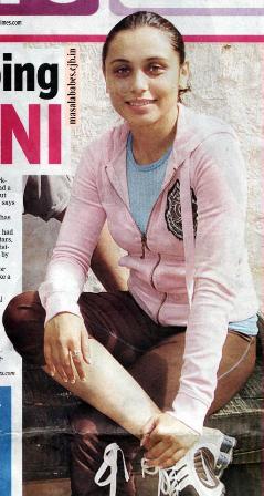 Rani goes for a morning jog in a cute ensemble that is very girly but functional at the same time. The combination of pink, blue and brown complements her skin tone well. The pulled back hair also accentuates her stunning features, which she then completes with a wry smile.