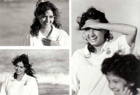 The lady with a beautiful smile had got these photographs clicked in a sea beach. She is wearing a t-shirt and has her curly hair tied up at the back with locks falling in front. Her smile melts hundreds of hearts, even now when she is in her 50’s.