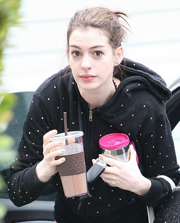 Much like everyone else, Anne Hathaway wears no makeup when she goes to get some coffee and bacons. Holding her order, she looks startled by the camera but holds her calm, as evident from her expression. As flawless as she appears, her hair gives an edge to the look overall.