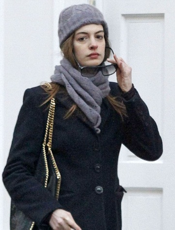 Anne Hathaway’s no-makeup look is going places in this picture, much like her confidence. She does not seem bothered that her photo is being taken and with the skull cap, shielding the winter appears to be an easy thing. Her lips look rosy, and her face has the morning glow.
