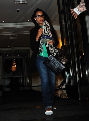 Kerry has always amazed us with her sudden style changes, be it casual day track pants or fitted going to the coffee denim. Dressed trendy in her jeans and black coat, Kerry left the building with her glasses on and showed clear signs of no makeup on her face.