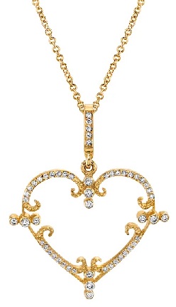 This brilliant and delicate, yellow gold heart is set with white diamonds. The rich yellow gold covers with diamonds and makes this piece the most elegant addition to any collection. Can be worn on gold chains or the pendant holder necklaces.