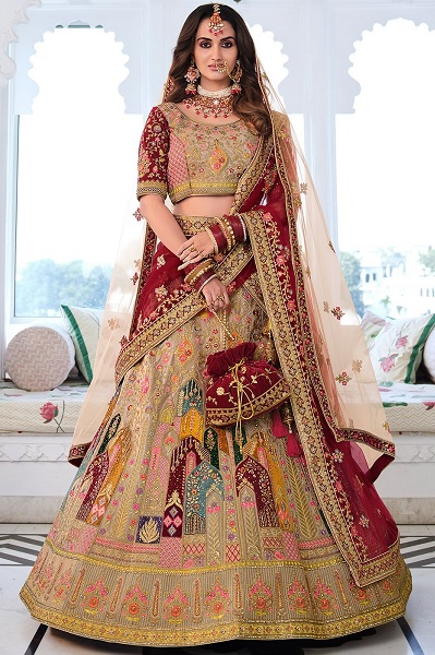 This beige colour velvet bridal lehenga is a perfect example of a wedding lehenga set. The lehenga has a stunning multi-colour combination of zari and resham embroidery work. A matching embroidered choli with short sleeves makes the set most desirable. A maroon-laced net dupatta with a thin floral border completes the set. The velvet material used here is of top quality.