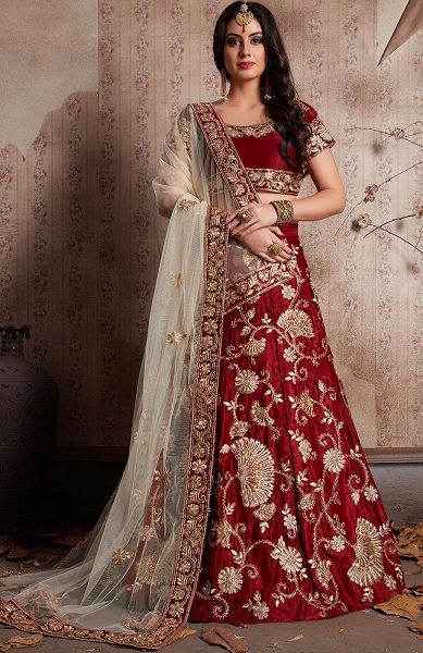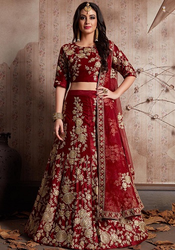 Choose this stunning maroon micro velvet lehenga with large embroidered motifs for the wedding season. The large floral motifs on the lehenga add glamour to the piece. The scoop neck choli with short sleeves is filled with embroidered work. The micro-velvet material is a nice choice for all. A net dupatta can be placed on the shoulder on one side.