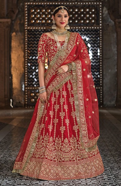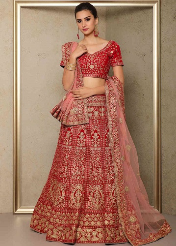 Red is the colour of the bride. This red velvet lehenga is traditional and perfect for brides to wear on their wedding day. The intricate and heavy embroidery work done on the lehenga, choli, and dupatta are just right for the bride. Choose this design to look your best on your wedding day. This will go well with bridal jewellery and other accessories.