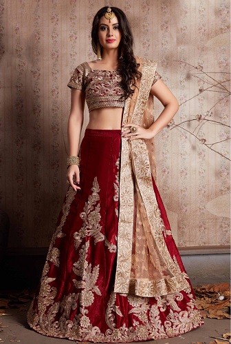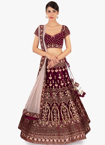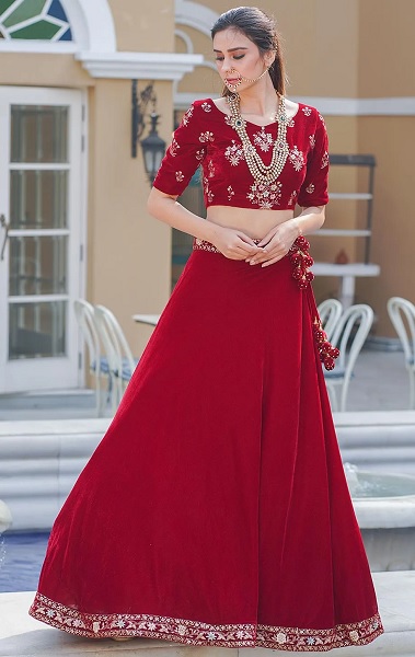 Lehenga designs in velvet are a nice addition to any woman’s wardrobe. The rich, bright colour and feel of the lehenga are what attract people to it. Velvet ka lehenga gives the wearer the glamorous feel required for special occasions. These lehengas can be embroidered with sequins and in various bright colours like red, maroon, blue, green, black and even purple. Lehenga sets can range from plain velvet to embellished velvet. Each of the sets works well with jewellery and footwear of any kind. So if you are looking for something that will mesmerize you, choose a velvet lehenga set.
