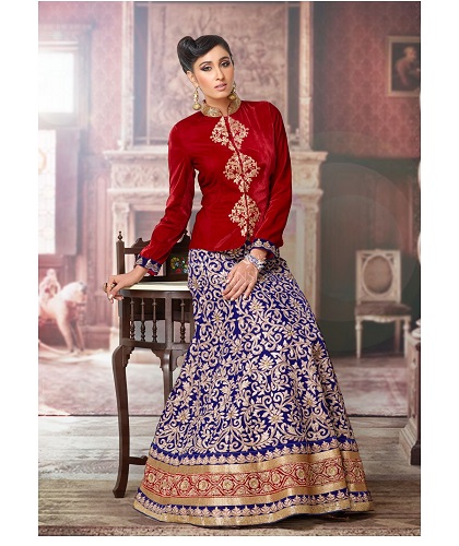 Choose something unique with this designer velvet ghagra choli. The blue velvet lehenga is filled with embroidery work in gold thread. The royal floral motifs used in the lehenga make it look really rich. A red border Patti with zari work fills the lehenga and makes it striking. The choli is contrasted red and has a collar too. This full-sleeved choli has diamond-shaped motifs on the front panel.