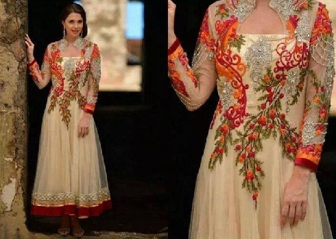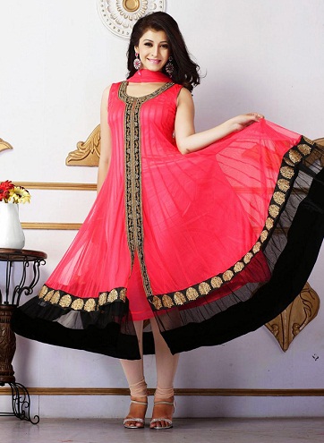 This is a relatively New Pakistani frock design, in which the frock dress vertically culminates into a bell shape appearing closely like an umbrella. This shape thus gives it a nice puffed up look and also the layout seems to be very interesting for a third person observer.