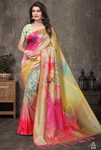 If you want add a pop of color to your wardrobe, this is can be an ideal choice. The bright, yet tasteful combination of cream, pink and blue can make you look angelic. This saree looks like a pure work of art with its creative print and quality silk fabric. The bright pink Tassels at the end of the Palla adds a touch of drama!